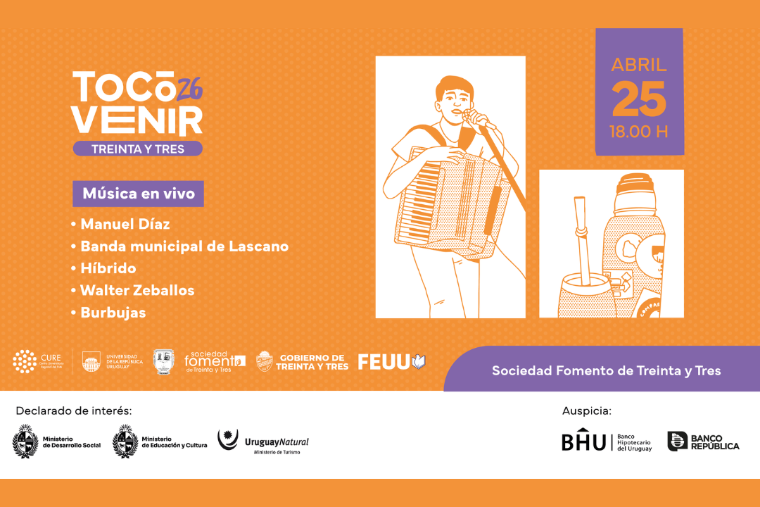 Tocó Venir Treinta y Tres: El 25 de abril el CURE recibe a sus nuevos estudiantes en la sede de Treinta y Tres El sábado 25 de abril, a partir de las 18.00 horas, se realizará una nueva edición de Tocó Venir en el CURE, sede Treinta y Tres, un