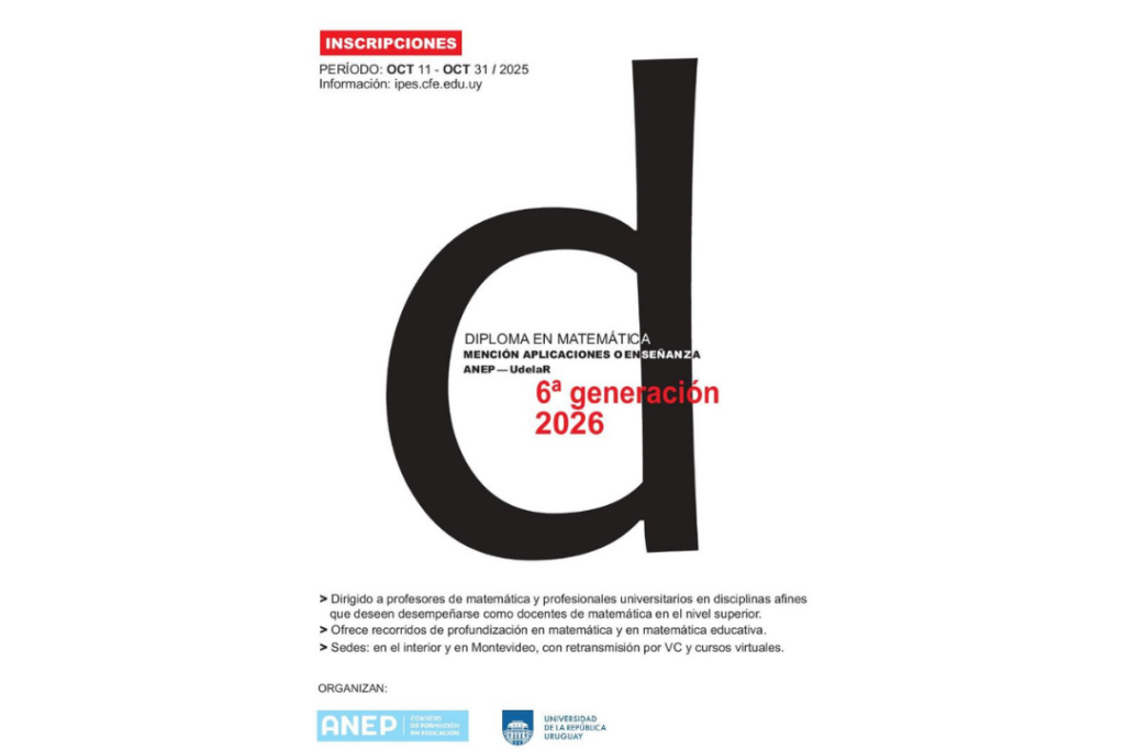 Abren inscripciones para la 6.ª cohorte del Diploma en Matemática Hasta el 31 de octubre de 2025 estarán abiertas las inscripciones para cursar el Diploma en Matemática, un posgrado conjunto entre ANEP y la Universidad de la República que ofrece dos menciones: Aplicaciones y Enseñanza. La elección de la mención se realiza durante el tercer […]