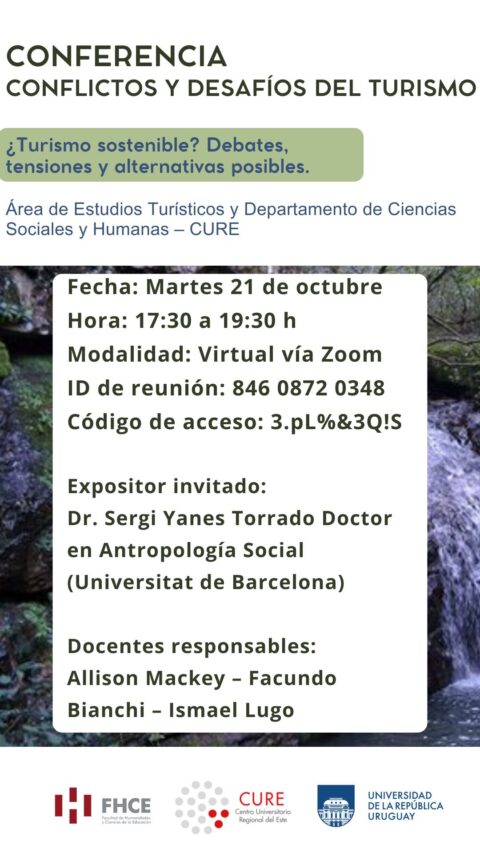 Esta actividad, dirigada a la comunidad académica y al público en general, se enmarca en la unidad curricular “¿Turismo sostenible? Debates, tensiones y alternativas posibles”, a cargo de Área de Estudios Turísticos y el Departamento de Ciencias Sociales y Humanas (CURE).