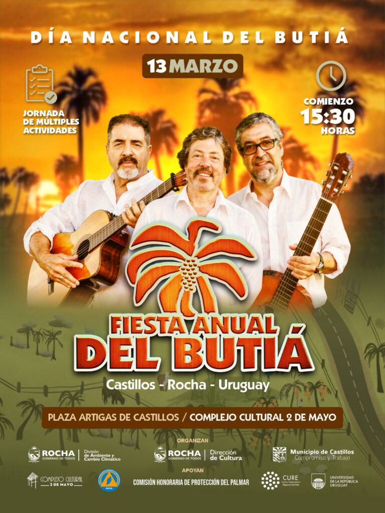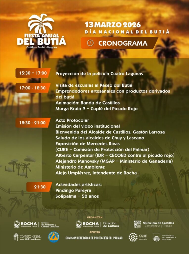 Desde temprano en la tarde habrá propuestas variadas en la ciudad de Castillos, departamento de Rocha. La fiesta contará con la proyección de la película Cuatro Lagunas, la participación de la Banda de Castillos y la murga Bruta 9, un paseo artesanal dedicado al butiá, así como charlas y disertaciones.