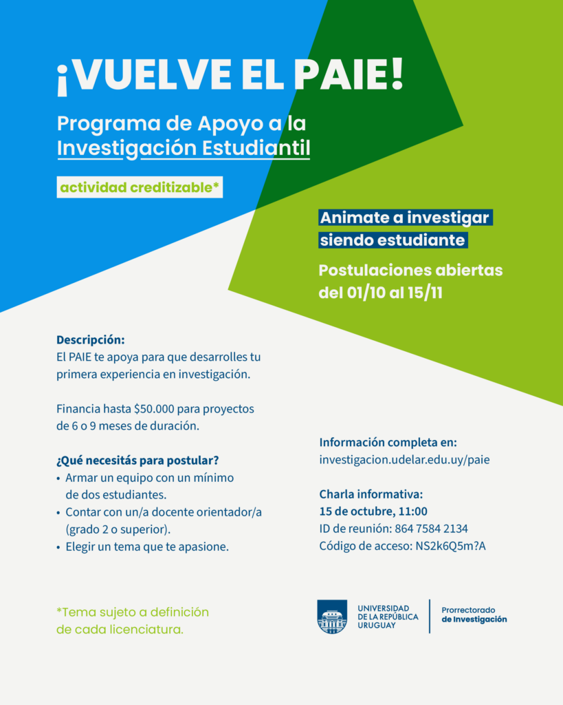 Las bases y el formulario de postulación estarán disponibles en el sitio del programa: investigacion.udelar.edu.uy/paie