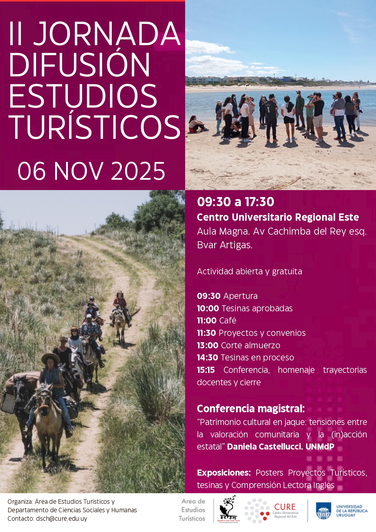 La jornada está organizado por el Área de Estudios Turísticos y el Departamento de Ciencias Sociales y Humanas del CURE, y constituye un espacio fundamental para visibilizar la producción académica y las experiencias formativas que se desarrollan en torno al turismo.