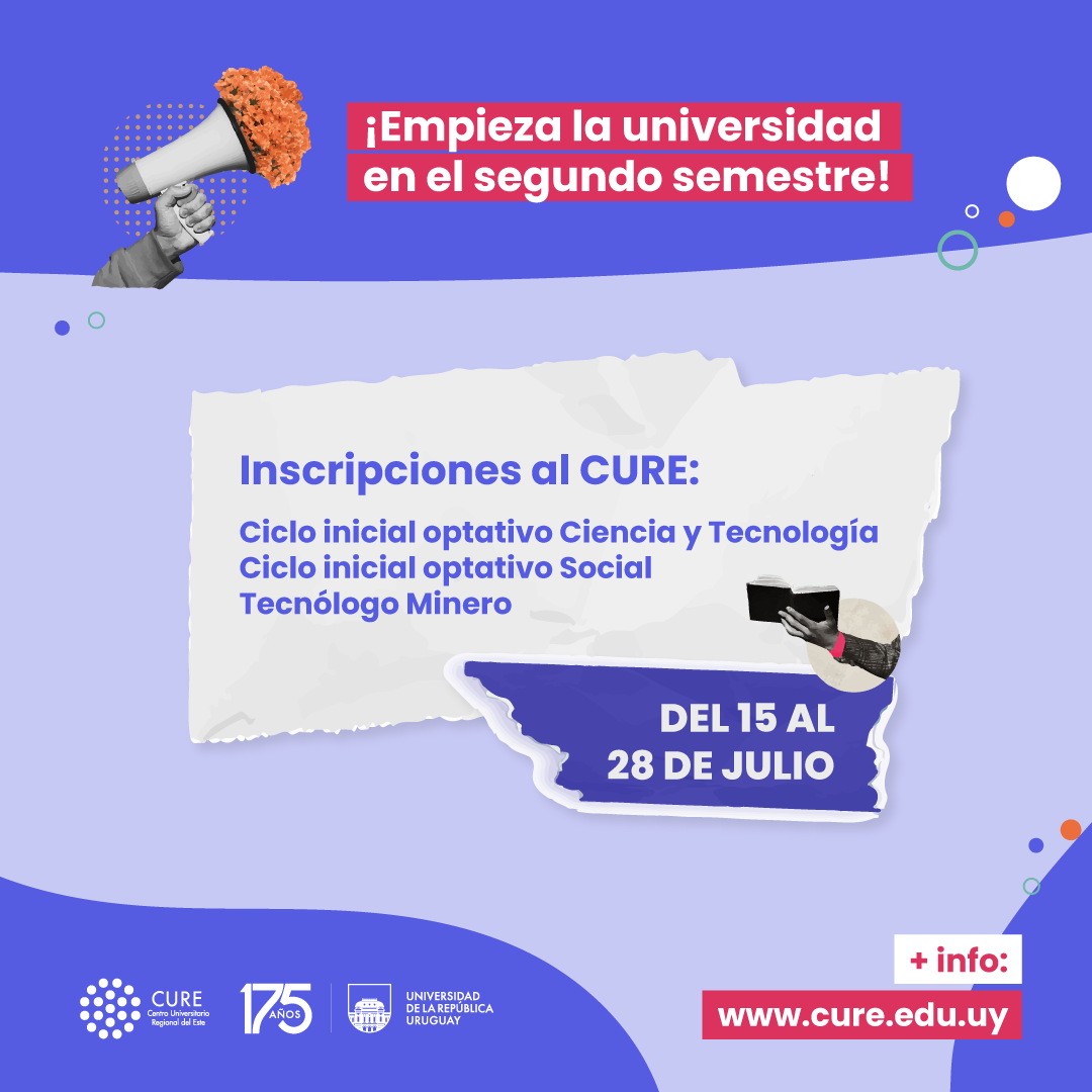 Empezá la universidad en el segundo semestre: ¡Inscripciones abiertas para los Ciclos Iniciales Optativos y Tecnólogo Minero del CURE a partir del lunes 15 de julio! La inscripciones a carreras para los Ciclos Iniciales Optativos y el Tecnólogo Minero se realizará del 15 al 28 de julio. Atención futuros estudiantes.