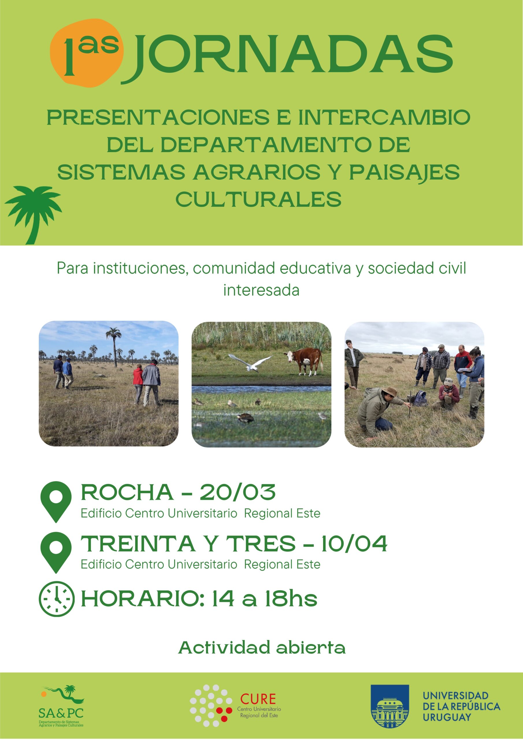 Las Primeras Jornadas del Departamento de Sistemas Agrarios y Paisajes Culturales del CURE se realizarán el 20 de marzo en la sede de Rocha y el 10 de abril en la sede de Treinta y Tres, entre las 14.00 y las 18.00 hs.