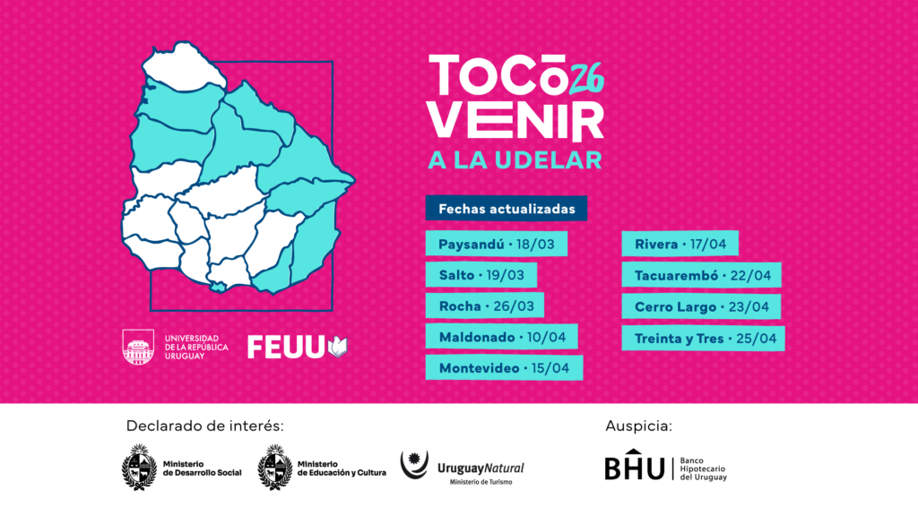 Udelar celebra el ingreso de una nueva generación con el «Tocó Venir» 2026 en todo el país La Universidad de la República (Udelar) lanza la edición 2026 del «Tocó Venir», el evento abierto y gratuito que da la bienvenida a las y los estudiantes que comienzan su formación en la institución. Esta propuesta, ininterrumpida desde […]