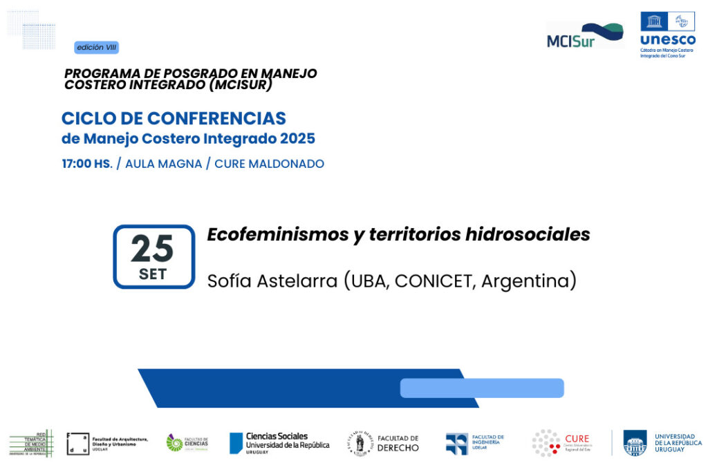 Conferencia sobre Ecofeminismos y territorios hidrosociales en CURE Maldonado El jueves 25 de setiembre a partir de 17.00 hs se llevará adelante la conferencia “Ecofeminismos y territorios hidrosociales” en el Aula Magna del Centro Universitario Regional del Este (CURE), sede Maldonado. La conferencia a cargo de la socióloga argentina, Sofía Astelarra, también se transmitirá en […]