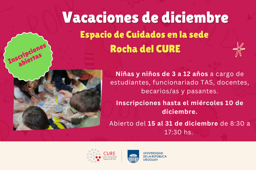 Espacio de Cuidados en Rocha abrirá sus puertas desde el 15 al 31 de diciembre La sede Rocha del Centro Universitario Regional del Este (CURE) informa que el Espacio de Cuidados abrirá sus puertas para niñas y niños de entre 3-12 años durante el receso de verano, desde el lunes 15 al miércoles 31 de […]