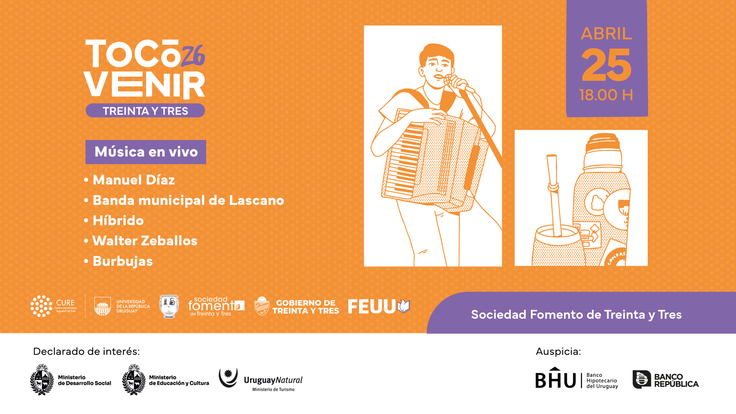El sábado 25 de abril, a partir de las 18.00 horas, se realizará una nueva edición de Tocó Venir en el CURE, en la Sociedad Fomento de Treinta y Tres, un evento abierto y gratuito que da la bienvenida a las y los estudiantes que comienzan su formación universitaria.